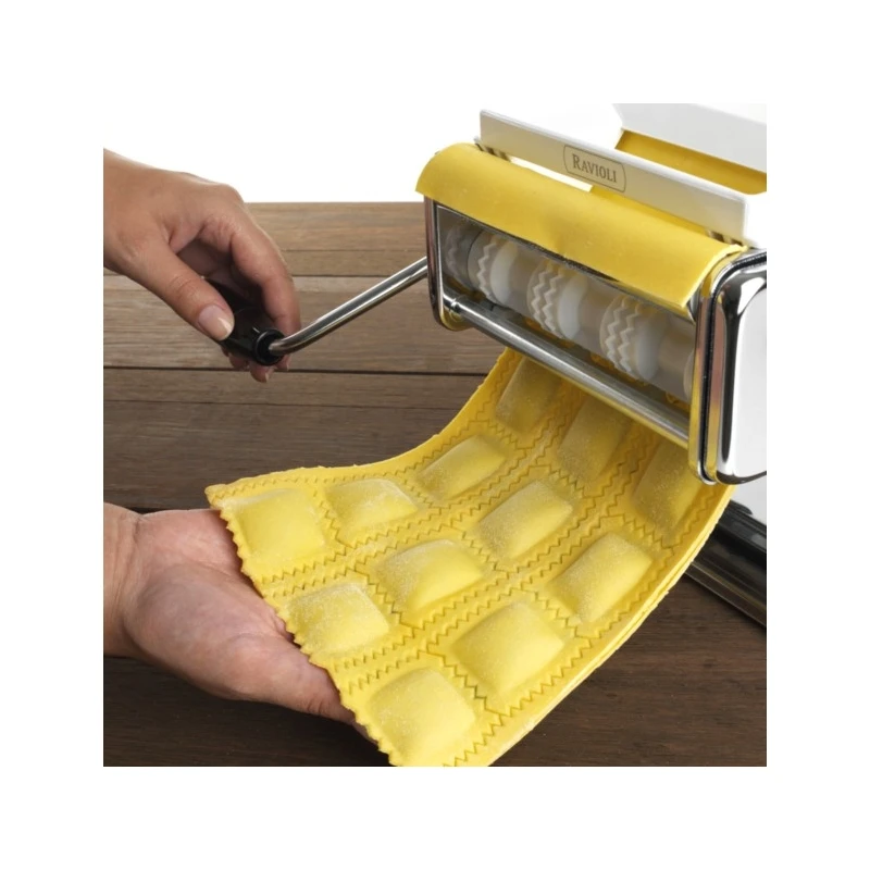 Modo di utilizzo: Realizzare il ripieno dei ravioli. Preparare l’impasto della pasta fresca. Realizzare con la macchina della pasta due sfoglie lunghe dello spessore. Applicare il raviolatore alla macchina per la pasta, inserire le due sfoglie di pasta all’interno del raviolatore, a questo punto farcire con il ripieno realizzato in precedenza, girare la manovella ed i ravioli sono pronti per essere cotti.