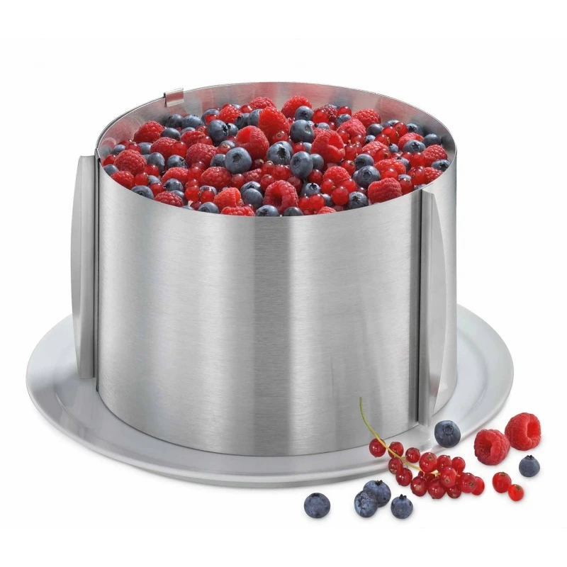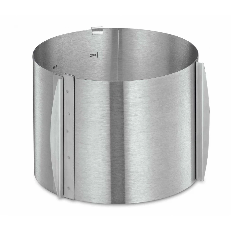 Con l’anello per torta extra alto, le tue creazioni elaborate prendono forma. Usa le maniglie per regolare il diametro, estensibile da 16 a 30 cm e aiutati a dosare con la pratica scala interna.
