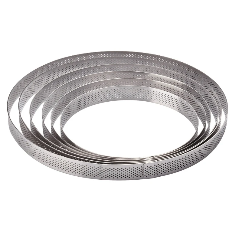Fascia rotonda microforata in acciaio inox, parte della linea “PROGETTO CROSTATE”, nata dalla collaborazione di Pavoni con il pastry chef Gianluca Fusto.