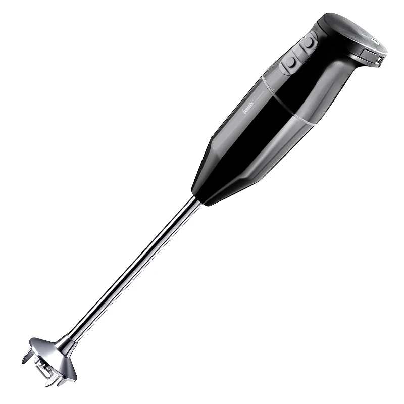 Il robot è dotato di tre velocità, raggiunge fino a 15.500 giri al minuto in modalità booster, attivabili grazie a due appositi tasti, morbidi alla pressione e rivestiti in gomma antiscivolo. Una peculiarità è l’impugnatura “invertita”, caratteristica dei modelli Bamix, che permette di azionare i tasti usando il pollice, mentre si tiene saldo il frullatore con le altre quattro dita.