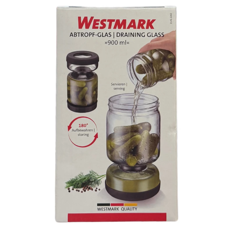 Con una capacità di 900 ml e un design compatto e funzionale, è perfetto per olive, cipolline, cetriolini e altri ingredienti conservati in liquido.