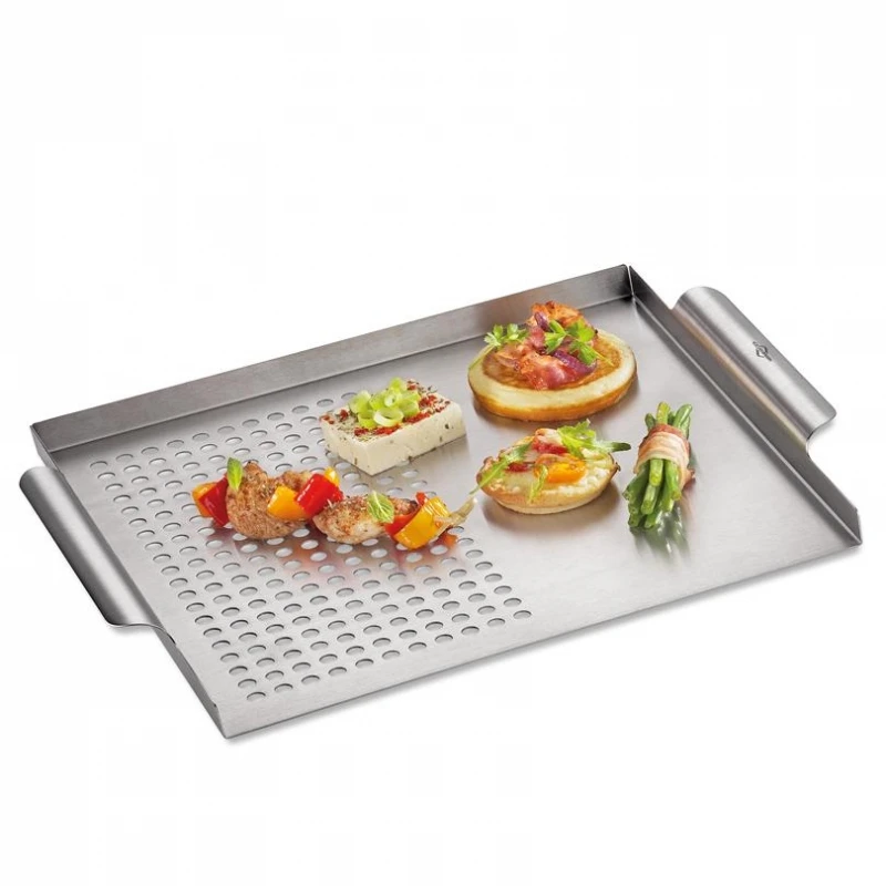 La piastra grill per BBQ in acciaio inox di forma rettangolare ideale per grigliare gli alimenti più piccoli come cipolle, pomodori e zucchine, in modo sicuro evitando il fastidioso rischio di caduta degli alimenti sulla brace.