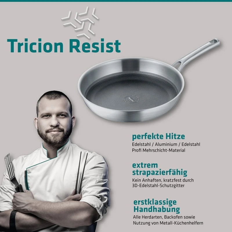 Padella della serie TRICION RESIST di Berndes, realizzata con una speciale struttura a tre strati sigillati insieme, di cui due in acciaio inossidabile di alta qualità e uno in alluminio, permette una conduzione del calore molto veloce, distribuendolo in maniera ottimale.