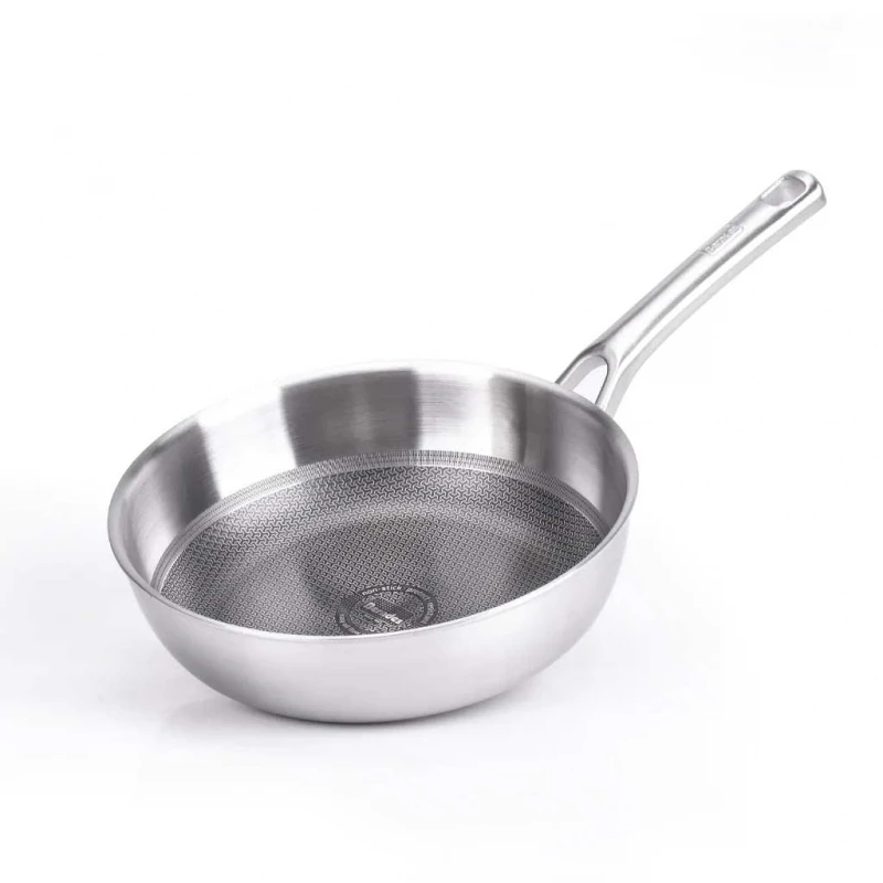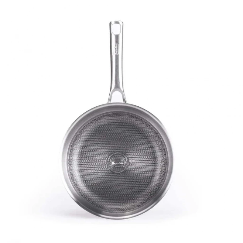 Il rivestimento antiaderente al quarzo “b.nature” – privo di PFAS e PTFE – è caratterizzato da una speciale robusta una griglia metallica intarsiata e leggermente in rilievo. La griglia permette di poter utilizzare la padella anche con utensili da cucina di metallo, senza rischiare di rovinare la superficie o comprometterne integrità e prestazioni.