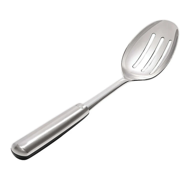 Il cucchiaio forato, parte della linea Steel di Oxo, ha un design elegante ed è ottimo per mescolare e servire in fase di preparazione e anche direttamente in tavola.