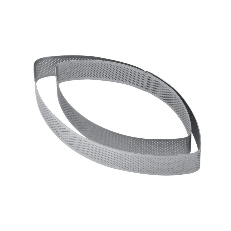 Fascia microforata in acciaio inox, a forma di ellisse, parte della linea “PROGETTO CROSTATE”, nata dalla collaborazione di Pavoni con il Pastry Chef Gianluca Fusto.