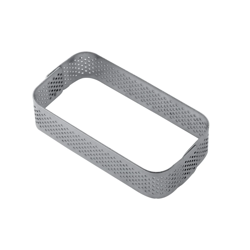 Fascia monoporzione rettangolare microforata in acciaio inox, con angoli arrotondati, parte della linea “PROGETTO CROSTATE”, nata dalla collaborazione di Pavoni con il Pastry Chef Gianluca Fusto.