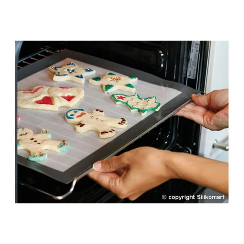 Tappetino in silicone e fibra di vetro, ideale per tutte le fasi di preparazione e cottura sia in cucina che in pasticceria.