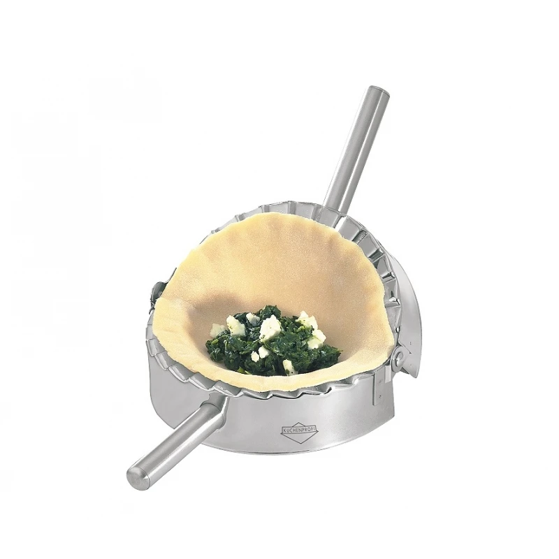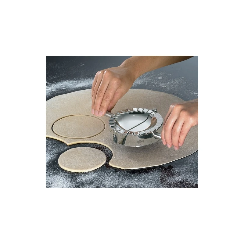 Stampino in acciaio inox che permette di realizzare ravioli a mezzaluna del diametro di 10 cm con bordo festonato. Ideale anche per preparare panzerotti con pasta pane, sfoglia o pizza.