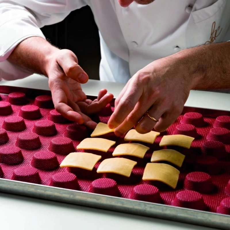 Le sagome sul tappetino costituiscono un’utile guida per un utilizzo ideale. Per la cottura poggiare lo stampo una teglia microforata e cuocere come da ricetta.