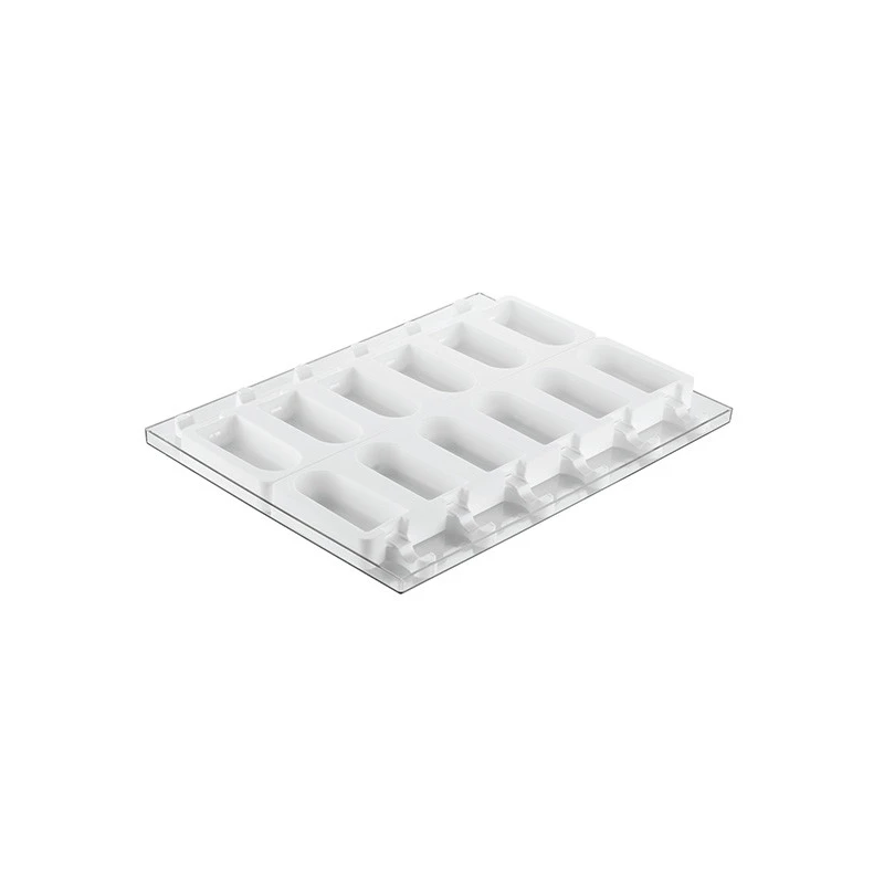 - due stampi, in silicone platinico, ciascuno composto da 6 cavità da 80 ml ognuna, con apposito foro per inserire lo stecco, per un totale di 12 gelati da preparare in un unica volta.