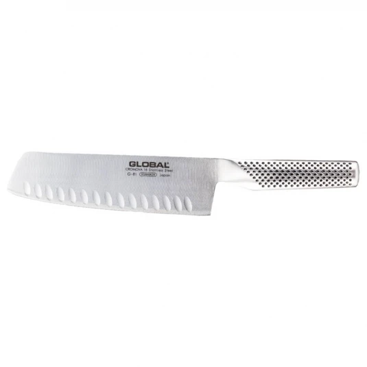 Il coltello asiatico Global G-81, (ex G-56), con lama lunga alveolare da 18 cm, affilata in entrambi i lati, è pensato per tagliare e sminuzzare le verdure con facilità e precisione.