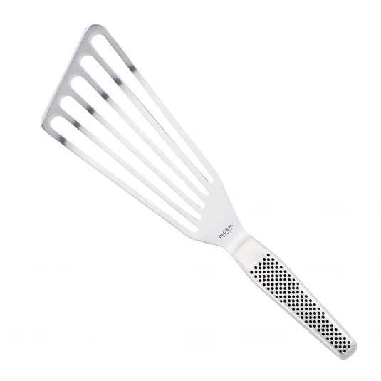 Global GS-27 è una paletta forata, leggermente angolata, sottile e flessibile, utile per servire, prendere e capovolgere gli alimenti, in particolare per i cibi da cucinare alla piastra, alla griglia o per impiattare.