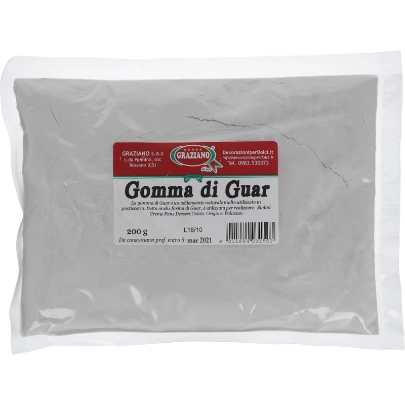 La gomma di Guar è un addensante naturale molto utilizzato in pasticceria. Detta anche farina di Guar, è utilizzata per realizzare: budini, creme, pane, dessert, gelati.