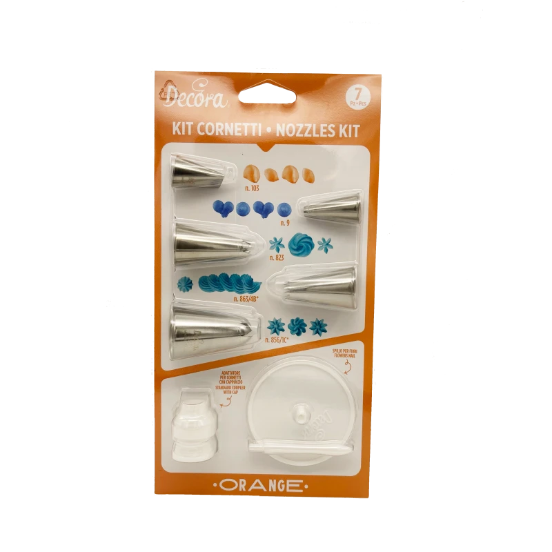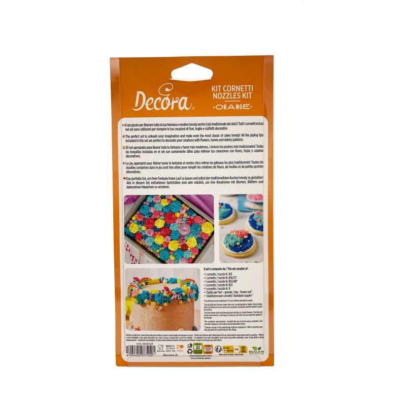 Cofanetto arancione contenente 5 bocchette, 1 spillo e 1 adattatore per la realizzazione di bellissime decorazioni.