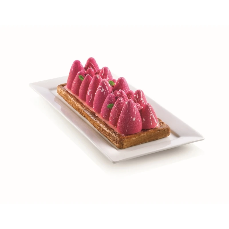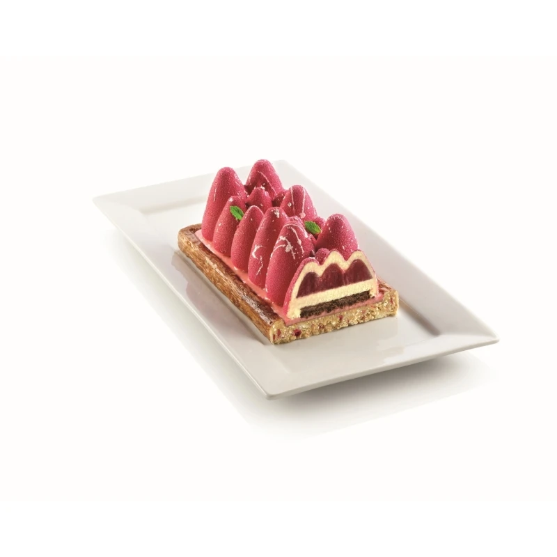 Le cavità dello stampo sono provviste di uno speciale bordo interno che conferisce una leggera forma arrotondata tridimensionale alla base delle vostre preparazioni. Garantisce risultati impeccabili non solo in versione semifreddo e mousse, ma anche in versione cotta.