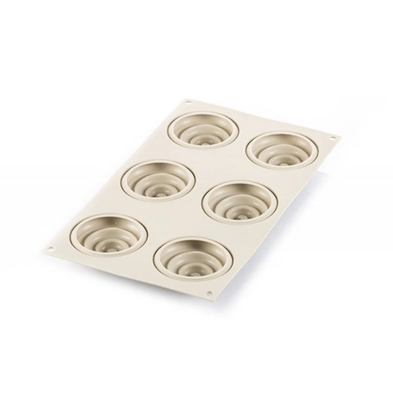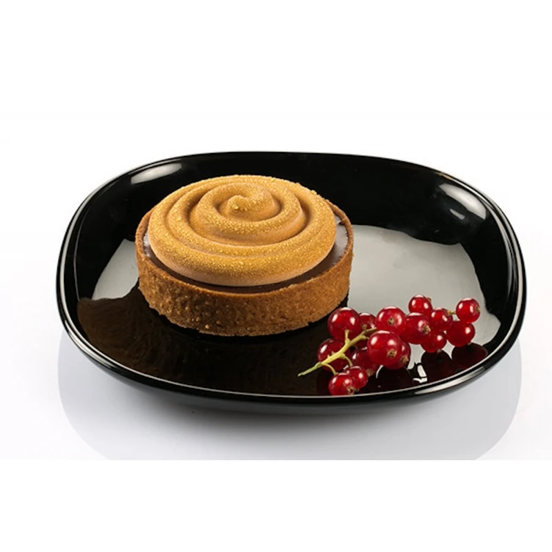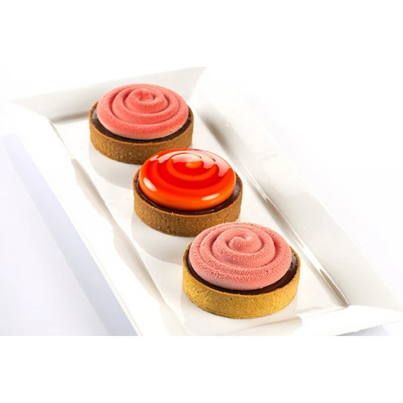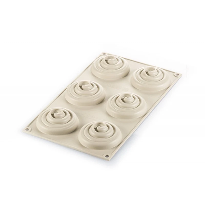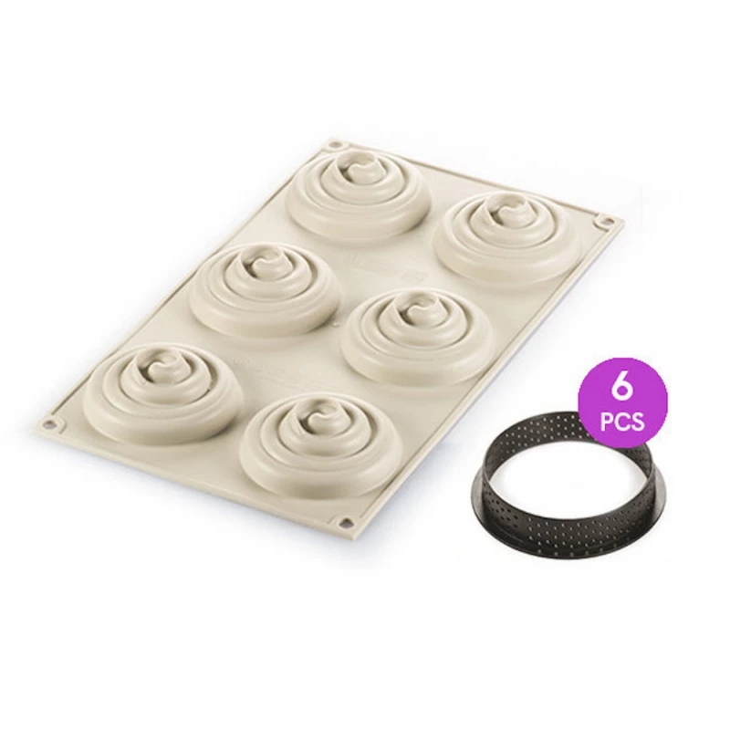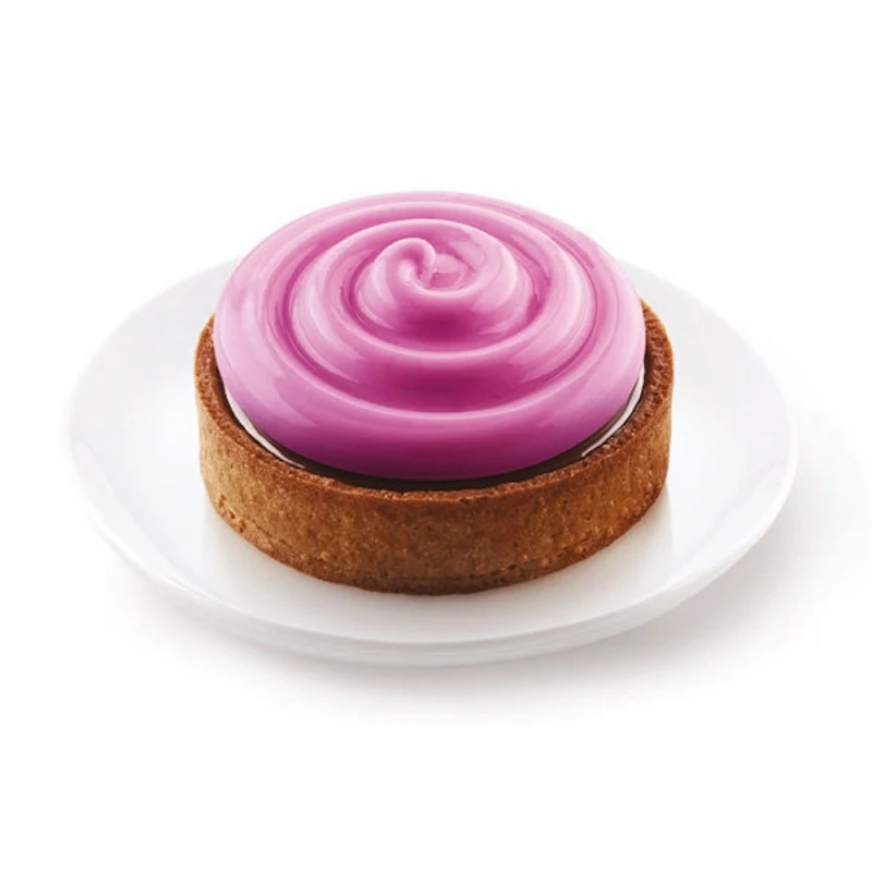 - uno stampo in silicone, con 6 impronte, delle dimensioni di Ø 7 cm H 2,5 cm ciascuno, con effetto 3D, perfetto per realizzare una mousse o una crema con un originale motivo a spirale, da stendere sulla pasta frolla.