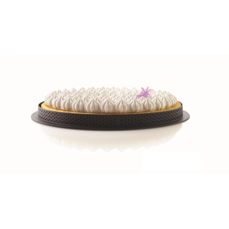 un anello, di forma rotonda, delle misure di Ø 25 cm H 2 cm, realizzato in materiale composito termoplastico, antiurto, antiaderente e inossidabile, adatto per la cottura in forno e per creare la base della crostata con bordi impeccabili, consente una cottura omogenea ed è caratterizzato da un’alta stabilità termica, grazie ai microfori che permettono all’umidità di evaporare.