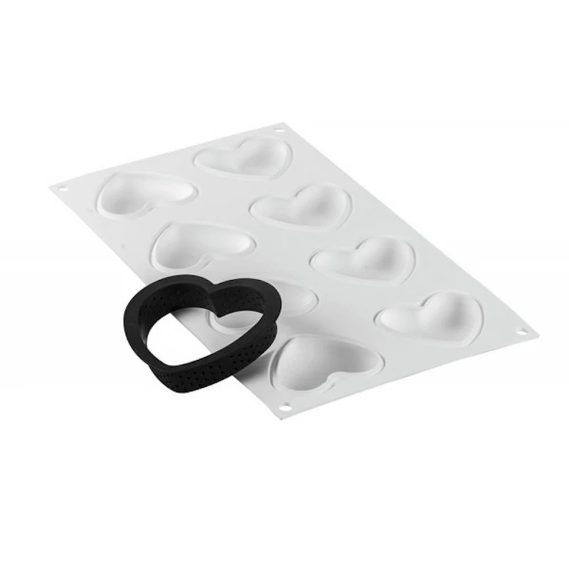 - uno stampo in silicone, con 8 impronte a forma di cuore, delle misure di 6,5 x 5,5 cm H 1,5 cm ciascuna, con effetto 3D, perfetto per realizzare una mousse o una crema con una romantica sagoma da stendere sulla pasta frolla.