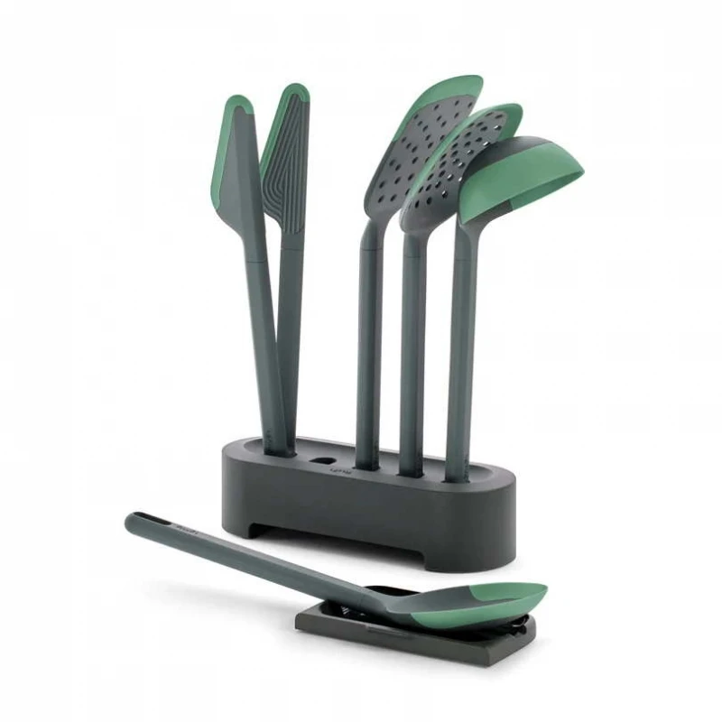 - Tipologia: set di utensili: 1 mestolo, 1 cucchiaione, 1 pinza, 1 paletta forata e 1 schiumarola, completi di base di appoggio e poggiamestolo.