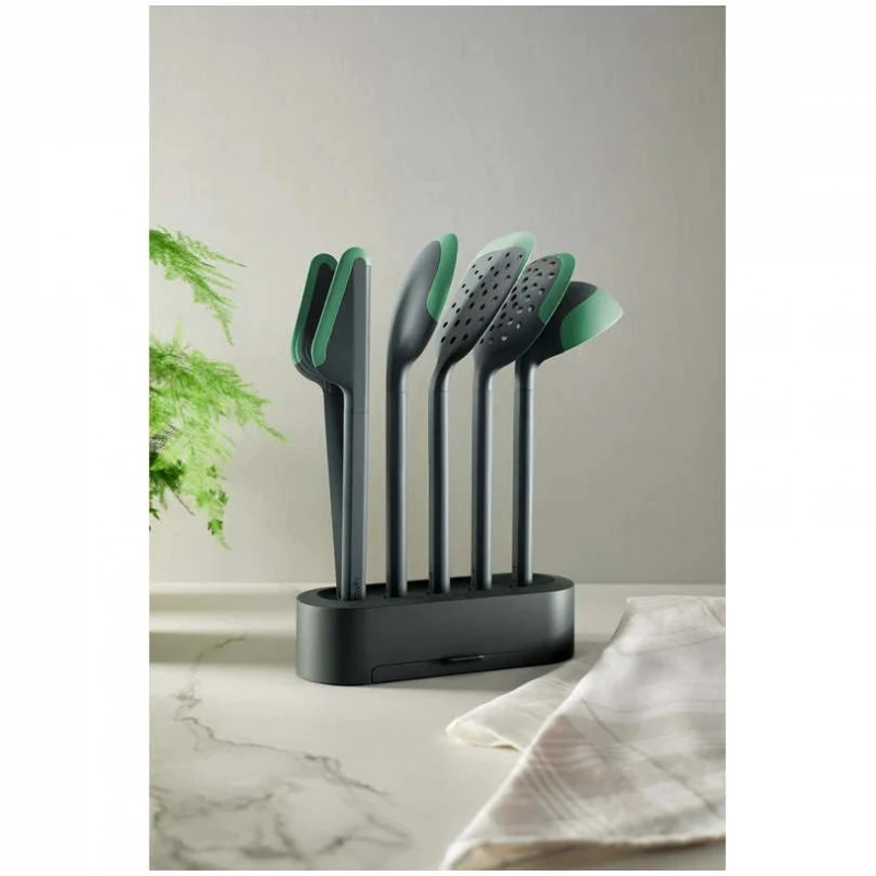 Set di 5 nuovi utensili da cucina indispensabili per la cucina quotidiana. Nel set è incluso anche un supporto con appoggia mestolo integrato, che vi permette di riporre gli utensili in modo ordinato e pulito, avendoli sempre alla portata di mano.
