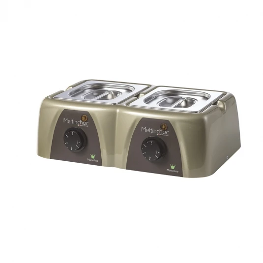 Questo modello di scioglitore Meltinchoc, realizzato in materiale plastico termoresistente, è dotato di 2 pratiche vasche removibili, in acciaio inox, da 1,5 litri ciascuna, con scocca e coperchio in plastica, e grazie al doppio termostato manuale – uno per ogni vasca – è possibile lavorare contemporaneamente diversi tipi di cioccolato.