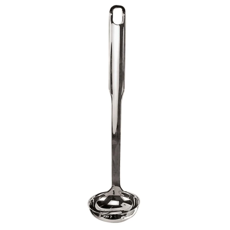 Mestolo in acciaio inox con possibilità di essere appeso grazie al foro presente sul manico.