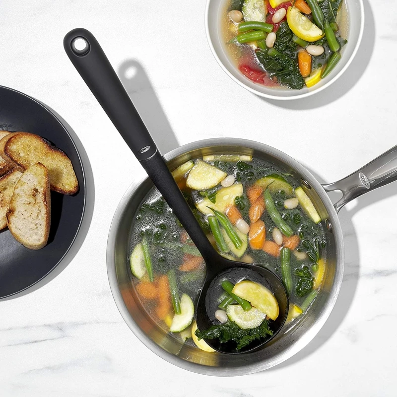 Il mestolo è ideale per servire zuppe, minestre, salse e spezzatino. Il foro sul manico permette di poterlo agganciare alla barra della cucina.