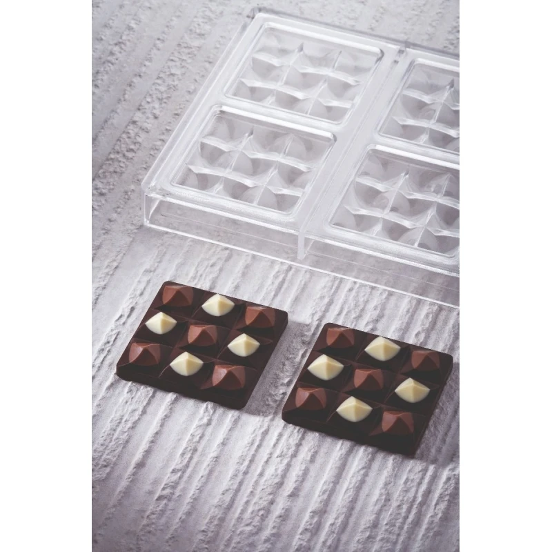 Questo stampo è realizzato in tecnopolimeri altamente qualitativi e resistenti che garantiscono, grazie alla superficie a specchio, la riuscita di tavolette di cioccolato perfette anche nei minimi dettagli.