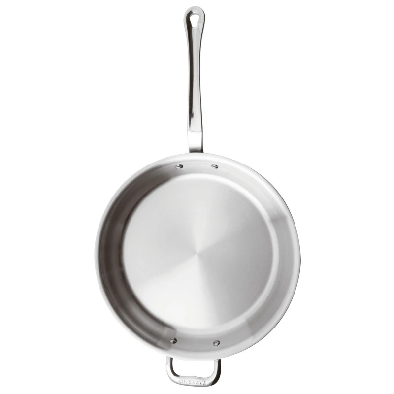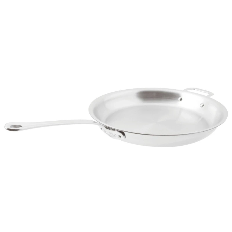 Gli strumenti di cottura della serie sono realizzati con una speciale struttura multilaminata a cinque strati – l’interno in acciaio inossidabile 18/10 satinato, l’anima in alluminio trilaminato e l’esterno in acciaio inossidabile per induzione con finitura a specchio – sigillati per formare un particolare materiale, che permette al calore di diffondersi, uniformemente e gradualmente, dal fondo al bordo della padella, durante la cottura.