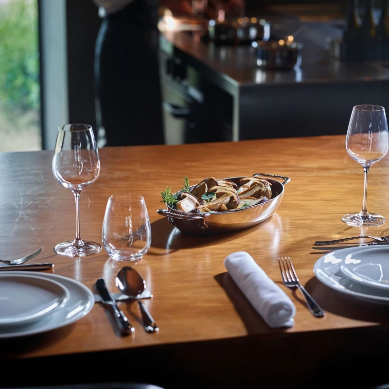 Gli strumenti di cottura della serie sono realizzati con una speciale struttura multilaminata a cinque strati – l’interno in acciaio inossidabile 18/10 satinato, l’anima in alluminio trilaminato e l’esterno in acciaio inossidabile per induzione con finitura a specchio – sigillati per formare un particolare materiale, che permette al calore di diffondersi, uniformemente e gradualmente, dal fondo al bordo della padella, durante la cottura.