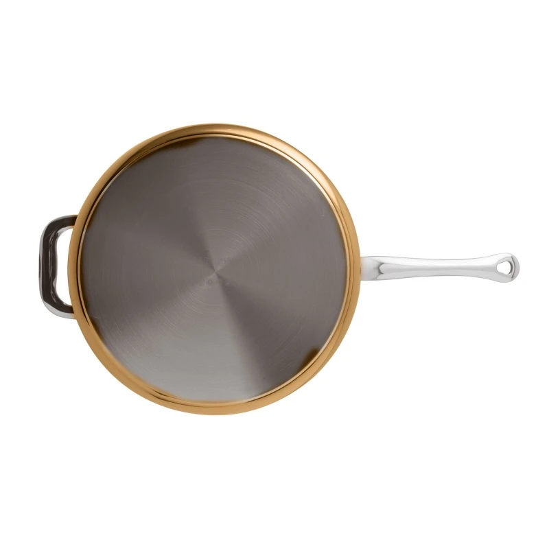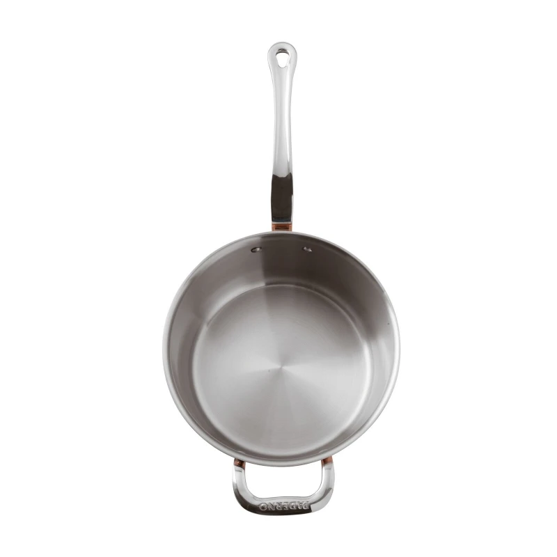 La lamina interna è in acciaio inossidabile, pratico e facile da pulire. L’anima in alluminio, leggero e ottimo conduttore di calore. L’esterno in rame finitura lucida, una tradizione in cucina, affascinante e bello da vedere.