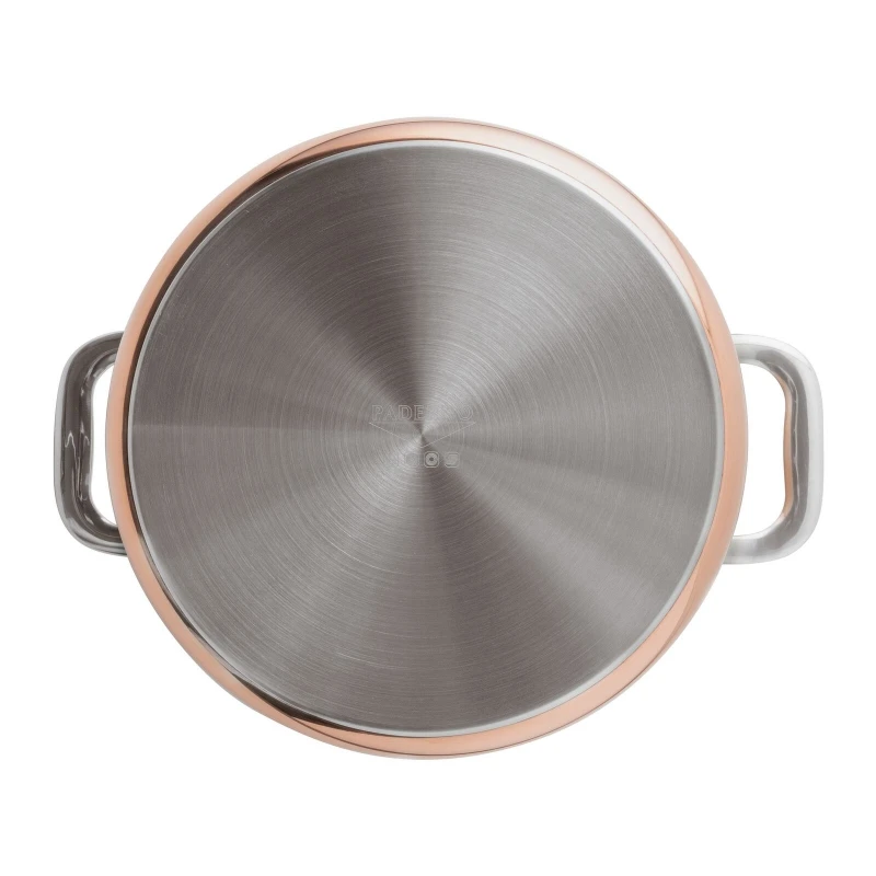 - Superficie interna in acciaio inox satinato, anima in alluminio e parte esterna in rame con una finitura lucida