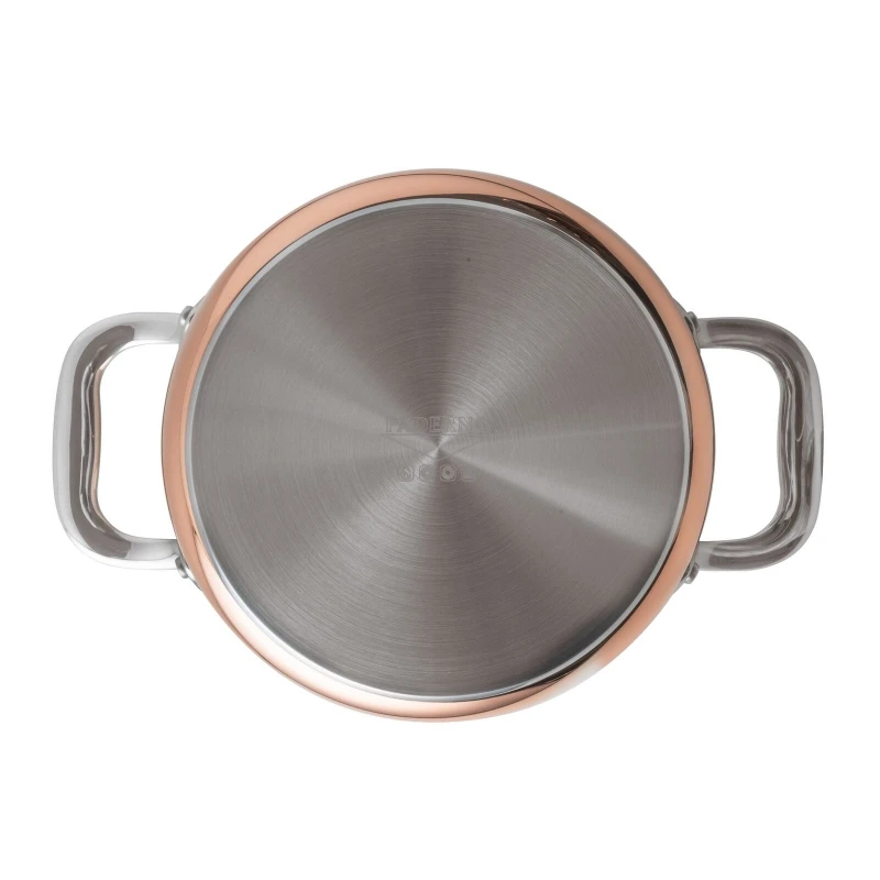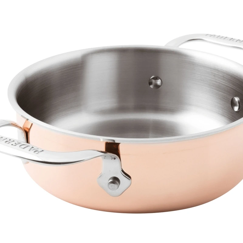 La lamina interna è in acciaio inossidabile, pratico e facile da pulire. L’anima in alluminio, leggero e ottimo conduttore di calore. L’esterno in rame finitura lucida, una tradizione in cucina, affascinante e bello da vedere.