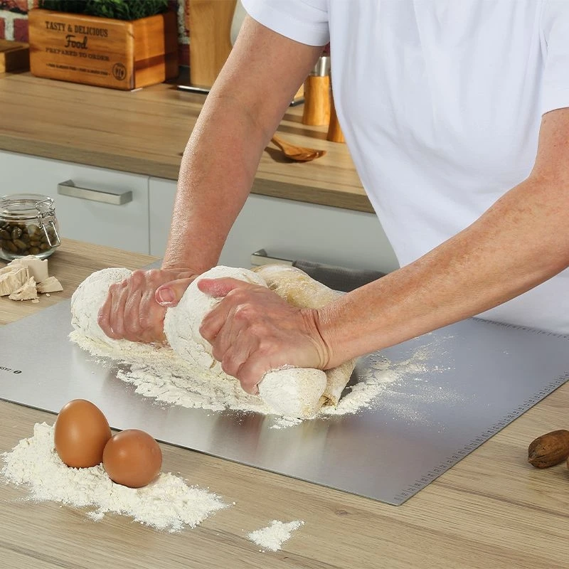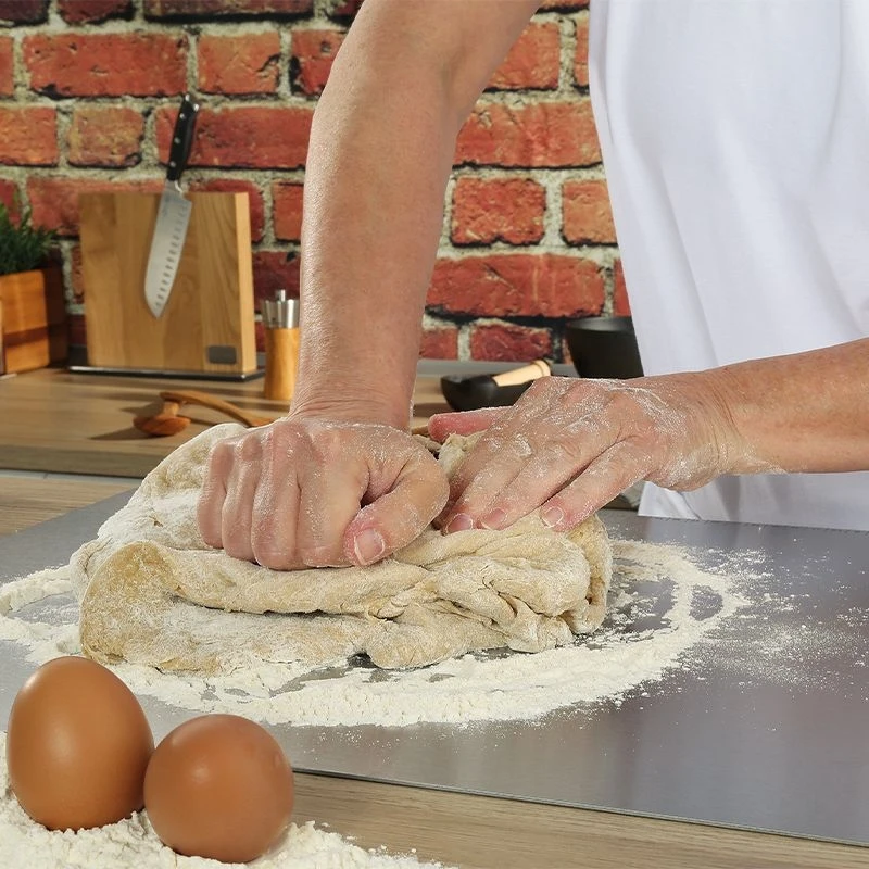 Il piano di lavoro fresco è ideale anche per impastare gli ingredienti per la pasta, la pizza o la pasta frolla. La pratica scala in cm mostra a colpo d’occhio quando si stende se l’impasto. Il bordo di arresto tiene saldamente il piano di lavoro sul tavolo e garantisce una manipolazione sicura.