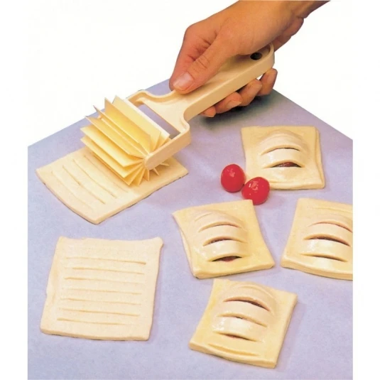Rullo tagliapasta per realizzare tagli paralleli uguali ed equidistanziati tra loro. Ideale per tagliare sfoglie di strudel, fagottini e carni in crosta.