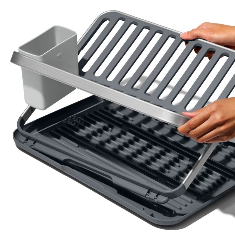 Questo scolapiatti si piega in piano per scolare piccole quantità di oggetti e può essere facilmente riposto quando non viene utilizzato. Un elegante scolapiatti per tutte le cucine.