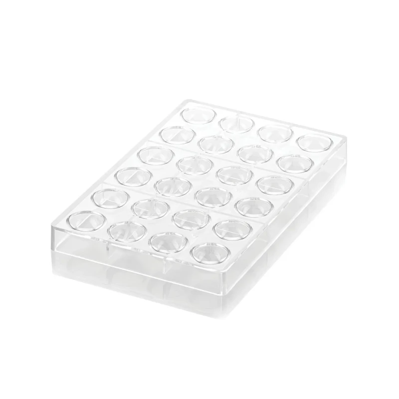 Semisfera 01-P è lo stampo professionale in Tritan™ progettato per realizzare praline dalla forma sferica perfetta. Con le sue 24 impronte, consente di ottenere cioccolatini lisci e uniformi. Il design preciso garantisce una resa impeccabile, valorizzando ogni creazione con un aspetto raffinato e dettagli definiti.
