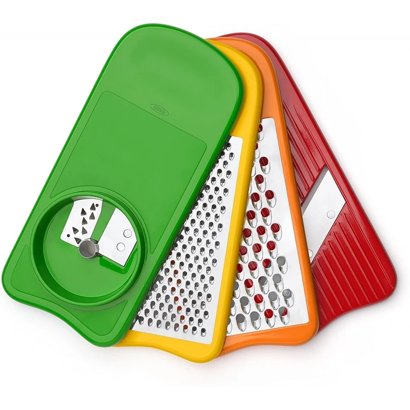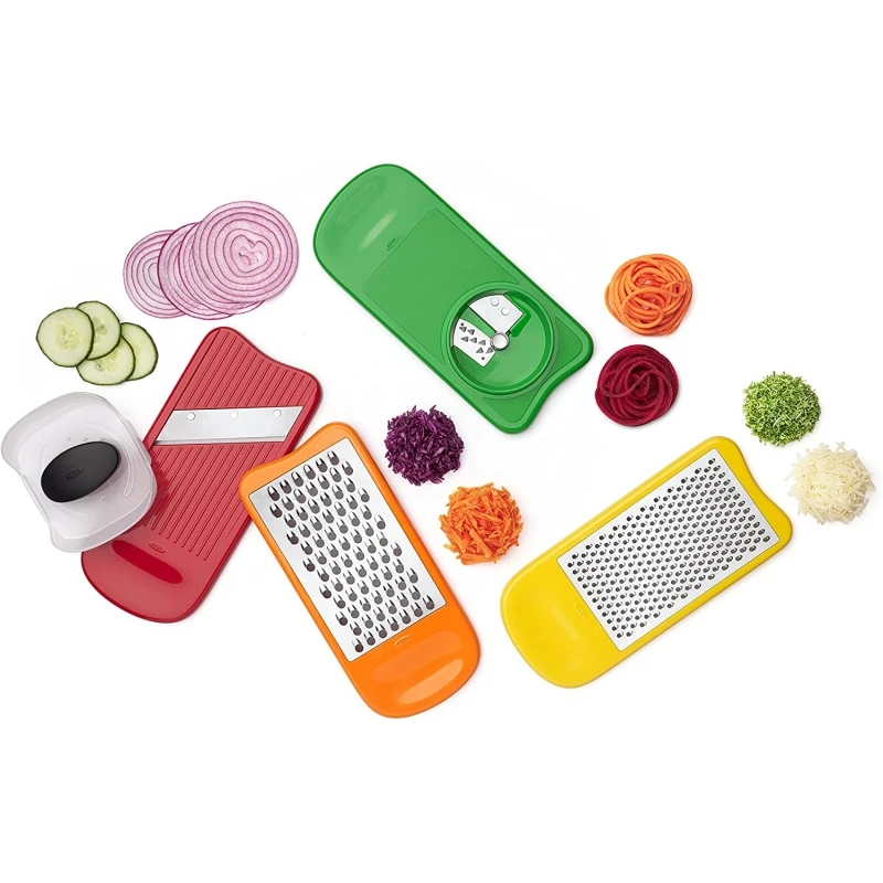 Questo set completo all-in-one di Oxo ha tutto il necessario per grattugiare ed affettare una grande varietà di ingredienti. Comodo e compatto, presenta lame per grattugiare a grana grossa e media e lame per taglio dritto e a spirale.
