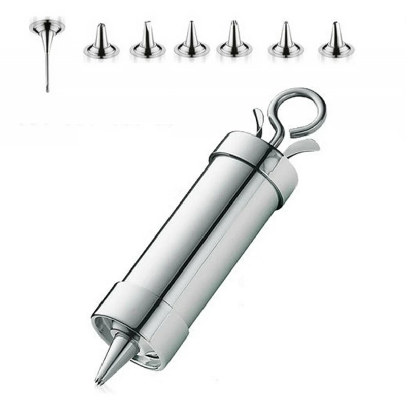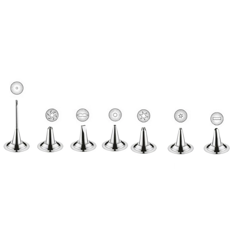 Siringa da pasticcere professionale in acciaio inossidabile, con sette beccucci, tra cui stella, rosetta e foglie, con chiusura a baionetta, ideale per decorare torte e dolci.