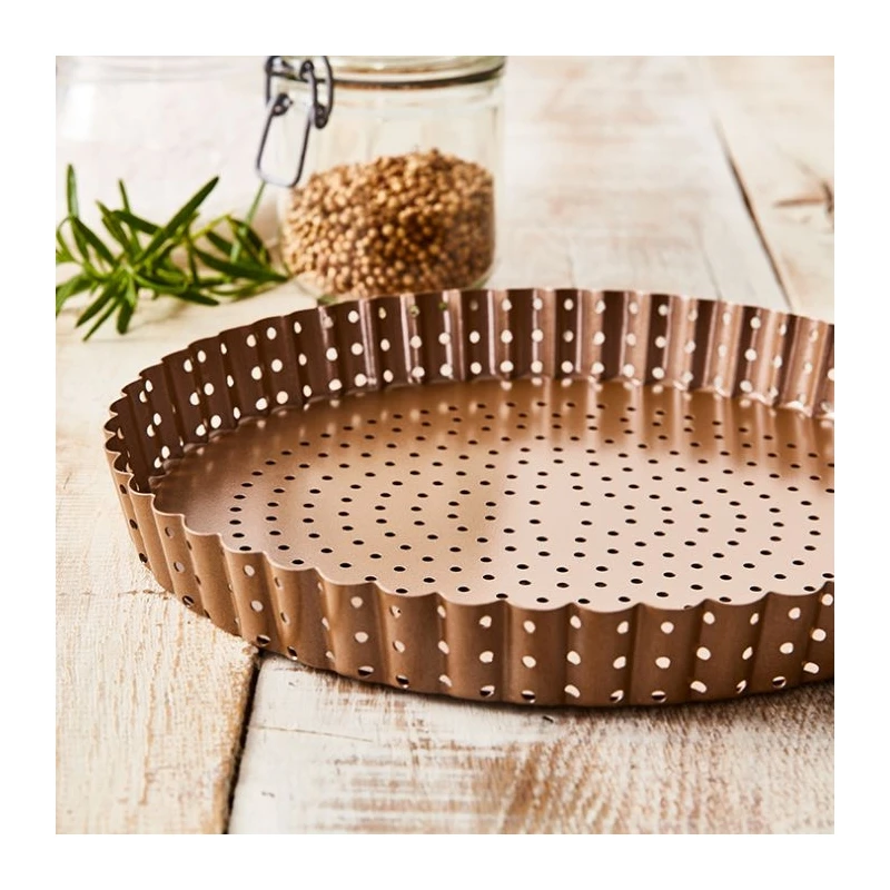 Realizza deliziose quiches, torte e crostate con questo nuovissimo stampo! Microforato, antiaderente, con base mobile e bordi ondulati. I fori lungo la base e sui lati fanno in modo che il calore circoli liberamente durante il processo di cottura per realizzare torte di frutta e quiche salate con una doratura perfetta dai bordi fino alla base.