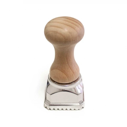 Stampo in alluminio, con manico in legno, di forma quadrata e con bordo festonato, dotato di espulsore automatico per realizzare cappelletti artigianali, in modo pratico e senza fatica.