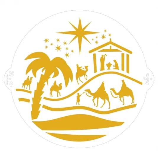 Grazie a questo stencil potrai realizzare una decorazione sulla tua torta a tema natività: un presepe con i Re Magi che giungono da lontano arricchiranno la tua torta natalizia.