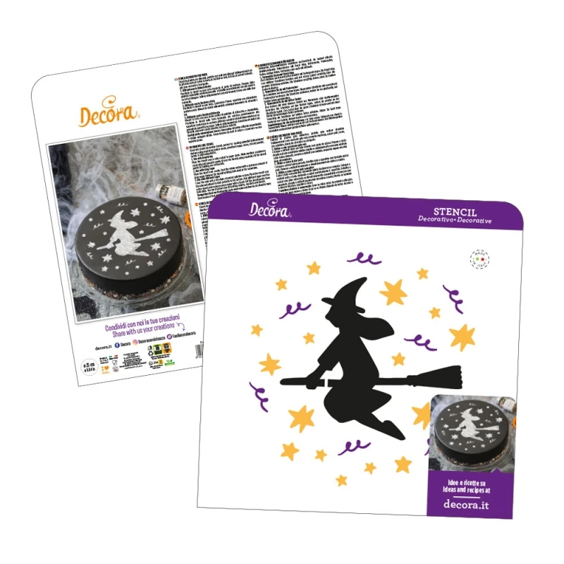 Scopri lo stencil decorativo Befana in plastica di Decora! Rappresenta una strega che vola sulla scopa, ideale per creare splendidi disegni su lle tue torte delle feste.