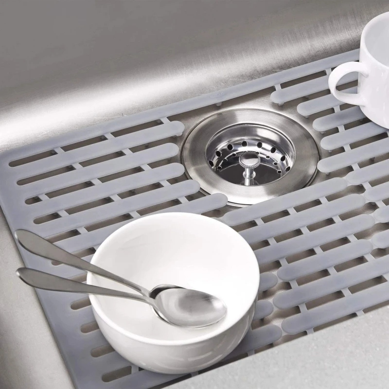 Tappetino in silicone adatto per proteggere i lavelli in acciaio inox da piatti, posate e bicchieri, in modo da non graffiare la superficie.