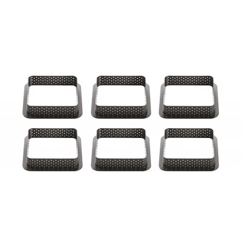 Set di 6 cornici microforate, di forma quadrata, delle misure di 8 x 8 cm ed altezza 2 cm, realizzati in materiale composito termoplastico, antiurto, antiaderente e inossidabile.
