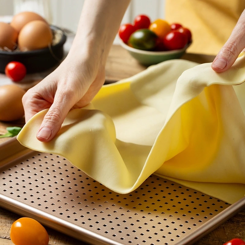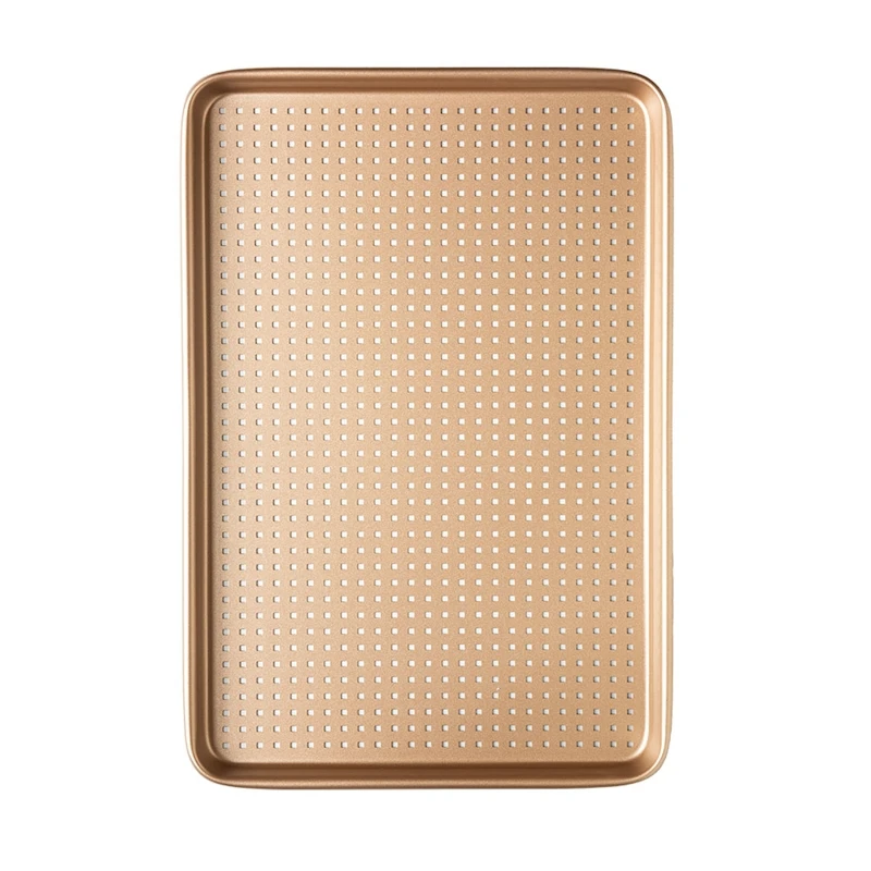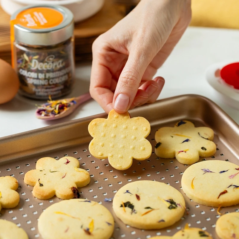 La Teglia Forata Cookies della Rose Gold Line di Decora è ideale per ottenere una cottura perfetta e uniforme di biscotti, focaccine, lievitati e molte altre preparazioni dolci e salate. Grazie alla superficie forata, questa teglia antiaderente consente la libera circolazione dell’aria, garantendo una cottura omogenea sia sopra che sotto, anche all’interno degli alimenti.