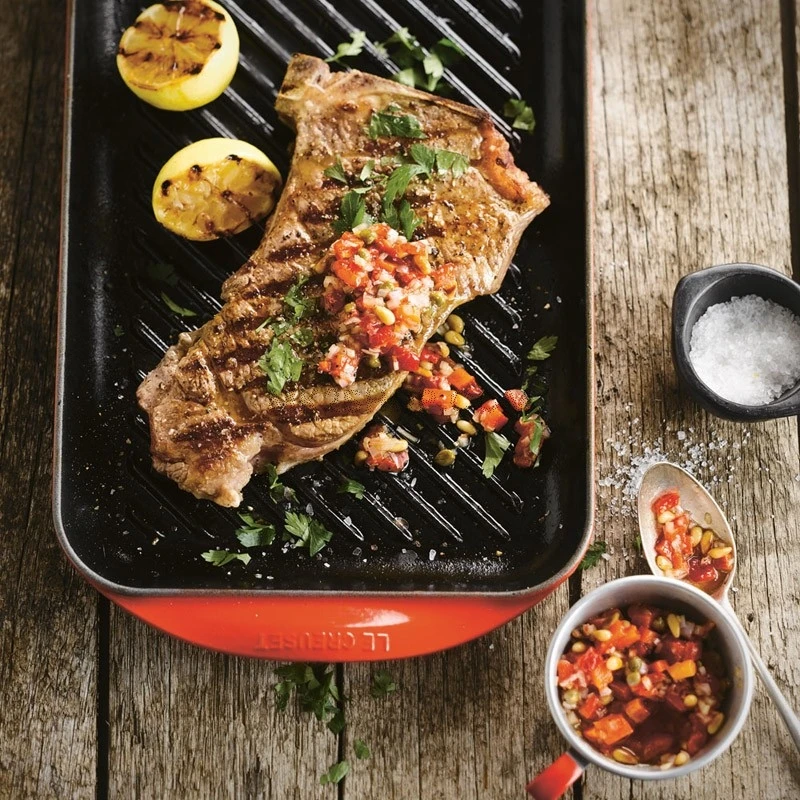 Interamente in ghisa fusa vetrificata, la piastra grill della linea Tradition di Le Creuset è ideale per qualsiasi tipo di alimento, permettendoti di assaporare nella tua cucina tutti i profumi e gli aromi di una grigliata all’aperto.