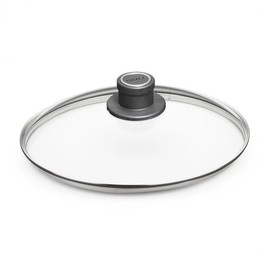 Coperchio rotondo in vetro temperato trasparente, dotato di uno sfiato permanente per il vapore e di un bordo in acciaio antiurto. Progettato per adattarsi perfettamente a tutte le pentole e padelle delle linee di Woll Diamond Lite e TiTAN Best.