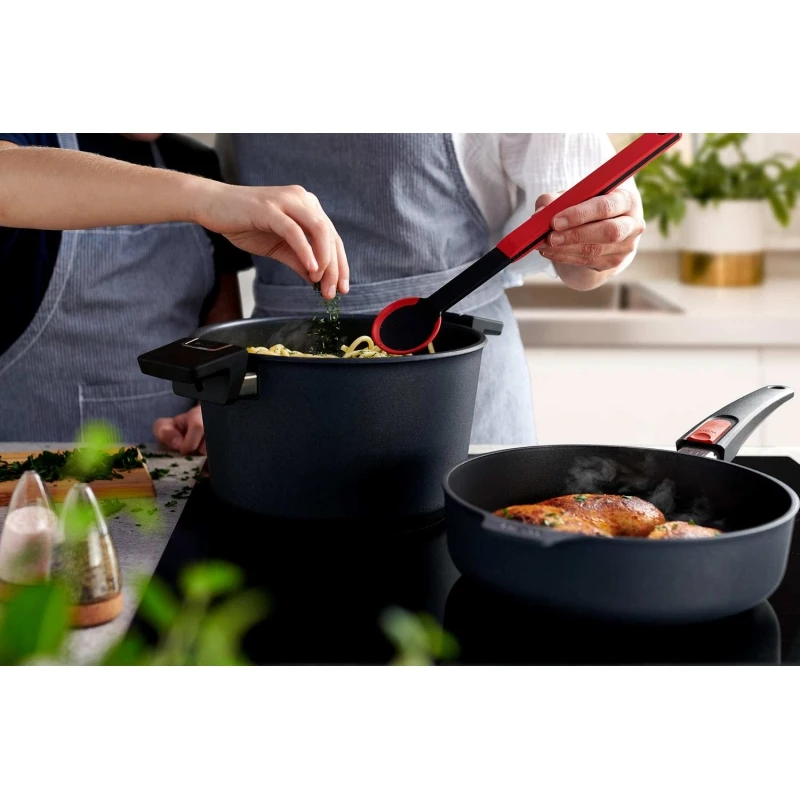 La pentola ha in dotazione un pratico coperchio, costruito con robusto vetro temperato e bordo antiurto in acciaio. La manopola è realizzata in materiale termoplastico di alta qualità. Il coperchio trasparente consente la visione degli alimenti durante la cottura!
